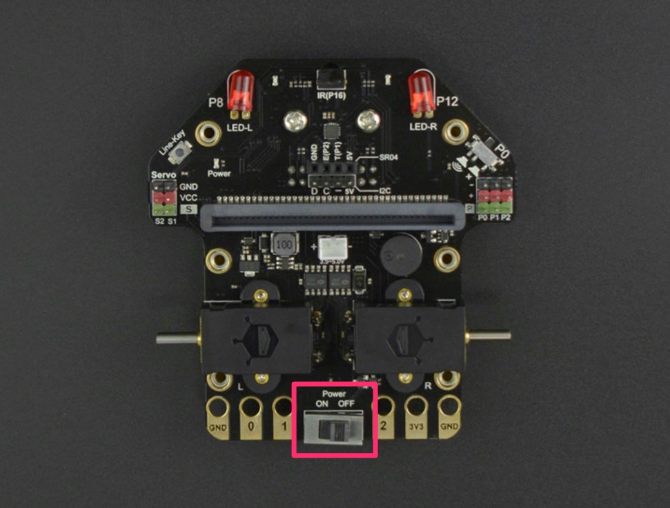 You can turn the Maqueen on or off using the power switch at the rear. This isolates the battery from the circuit board.