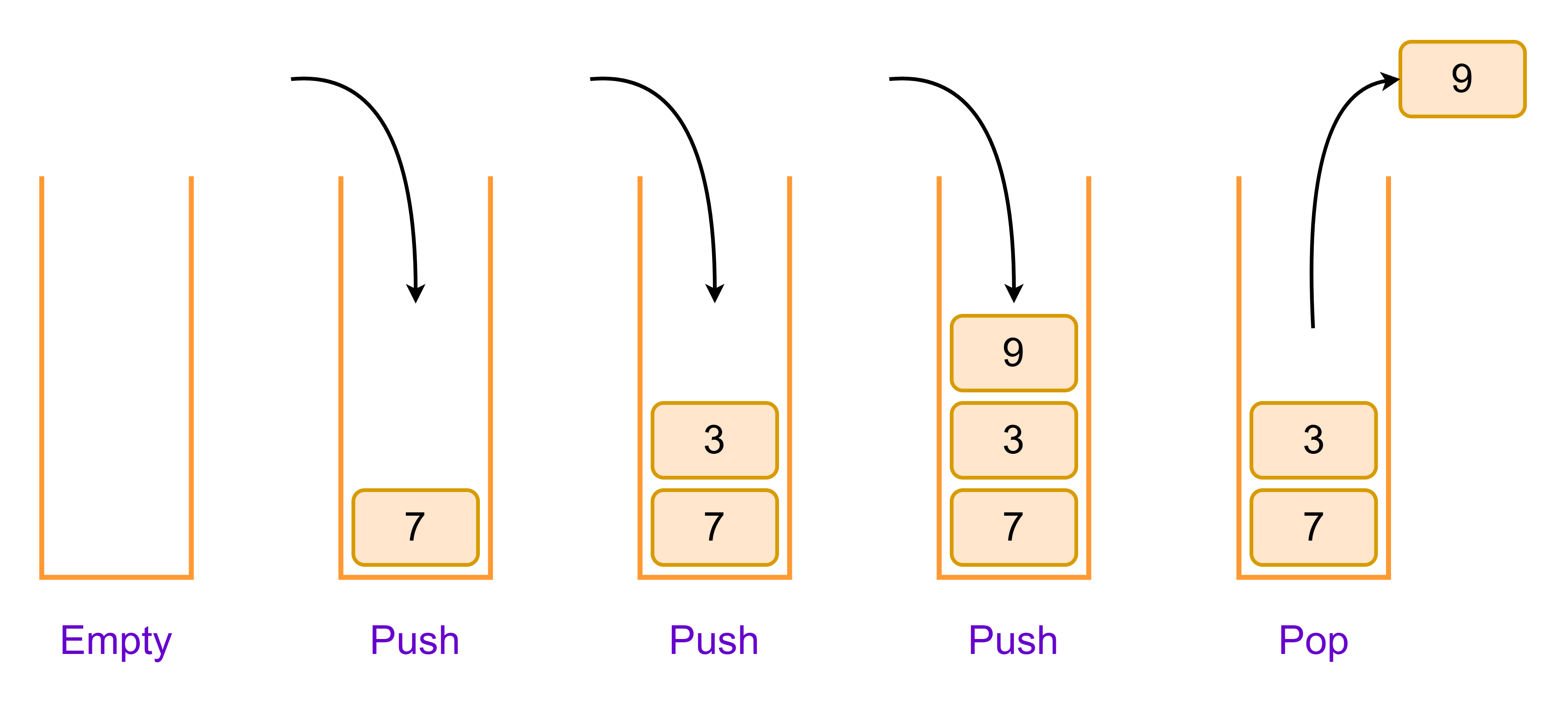 Stacks are LIFO data structures, meaning that we can only access the most recently placed (pushed) item onto the stack.