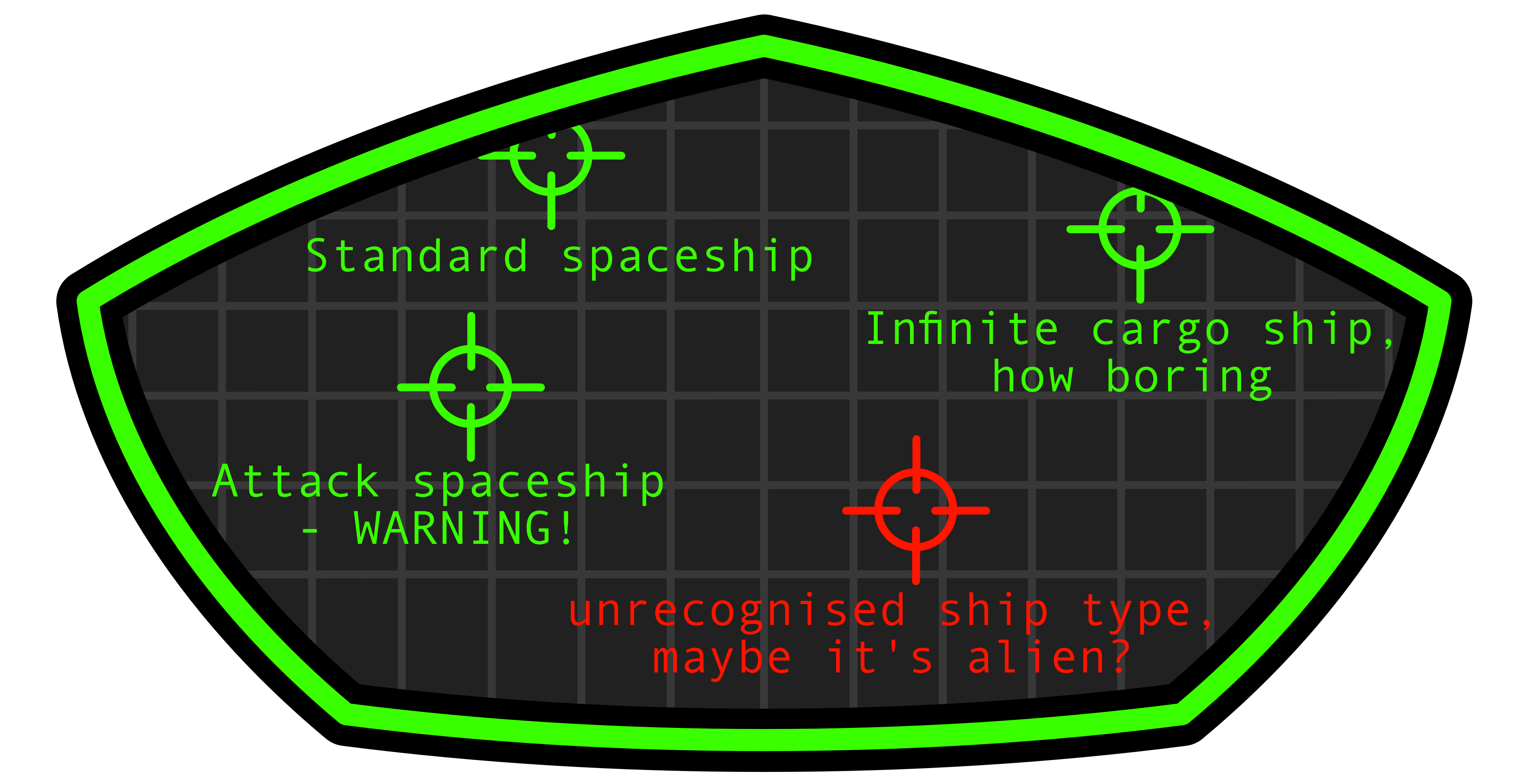 "Standard spaceship""Attack spaceship - WARNING!""Infinite cargo ship, how boring""Unrecognised ship type, maybe it's alien?"when the ship type is unknown