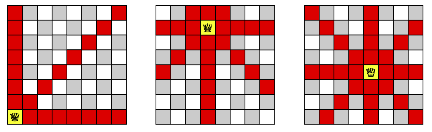 Here are some examples of queens placed on a chess board. The squares in red show the squares the queen can attack.