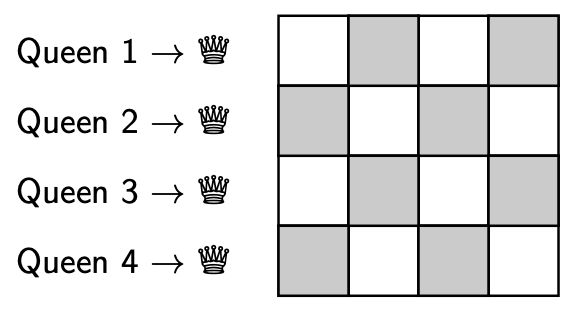 Let’s start with a 4x4 board. Since we know that each queen has to be in a different row, we’ll simplify this problem a little bit and allocate each queen a row. We’ll use the row number to refer to each queen, i.e. queen 1, …, queen 4.