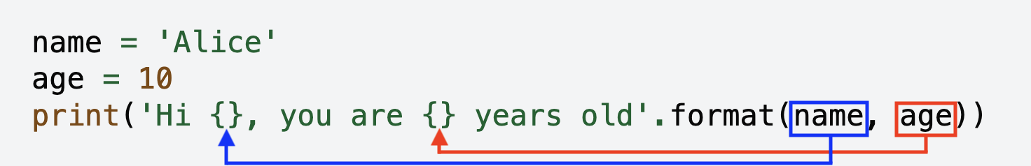 ().{}are placeholders. The information will be placed in order where the{}’s are in the string.