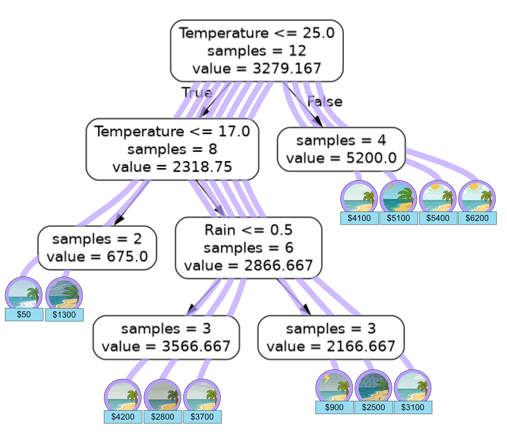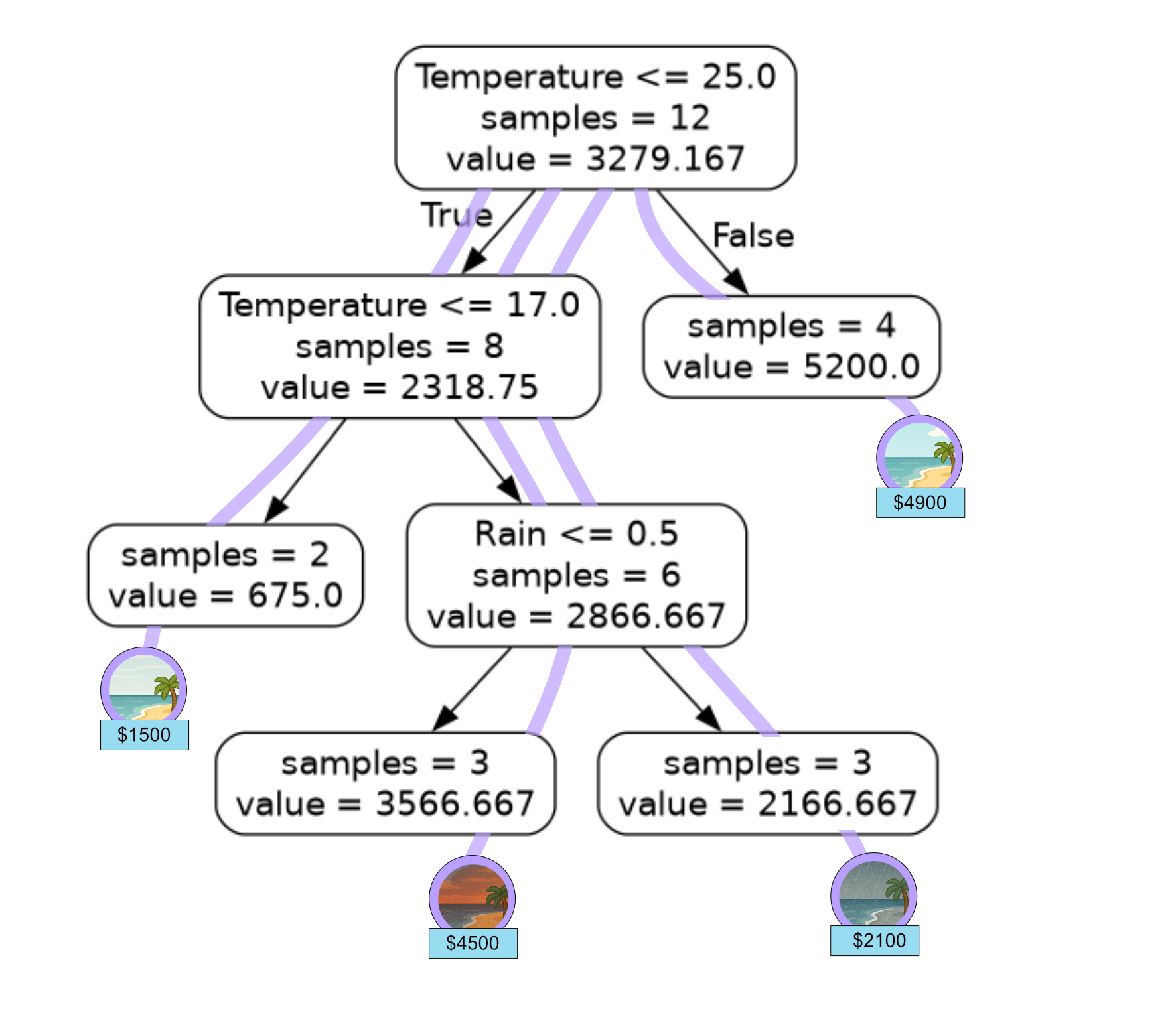 We can verify our models predictions by looking at how the test samples flow through our regression tree.