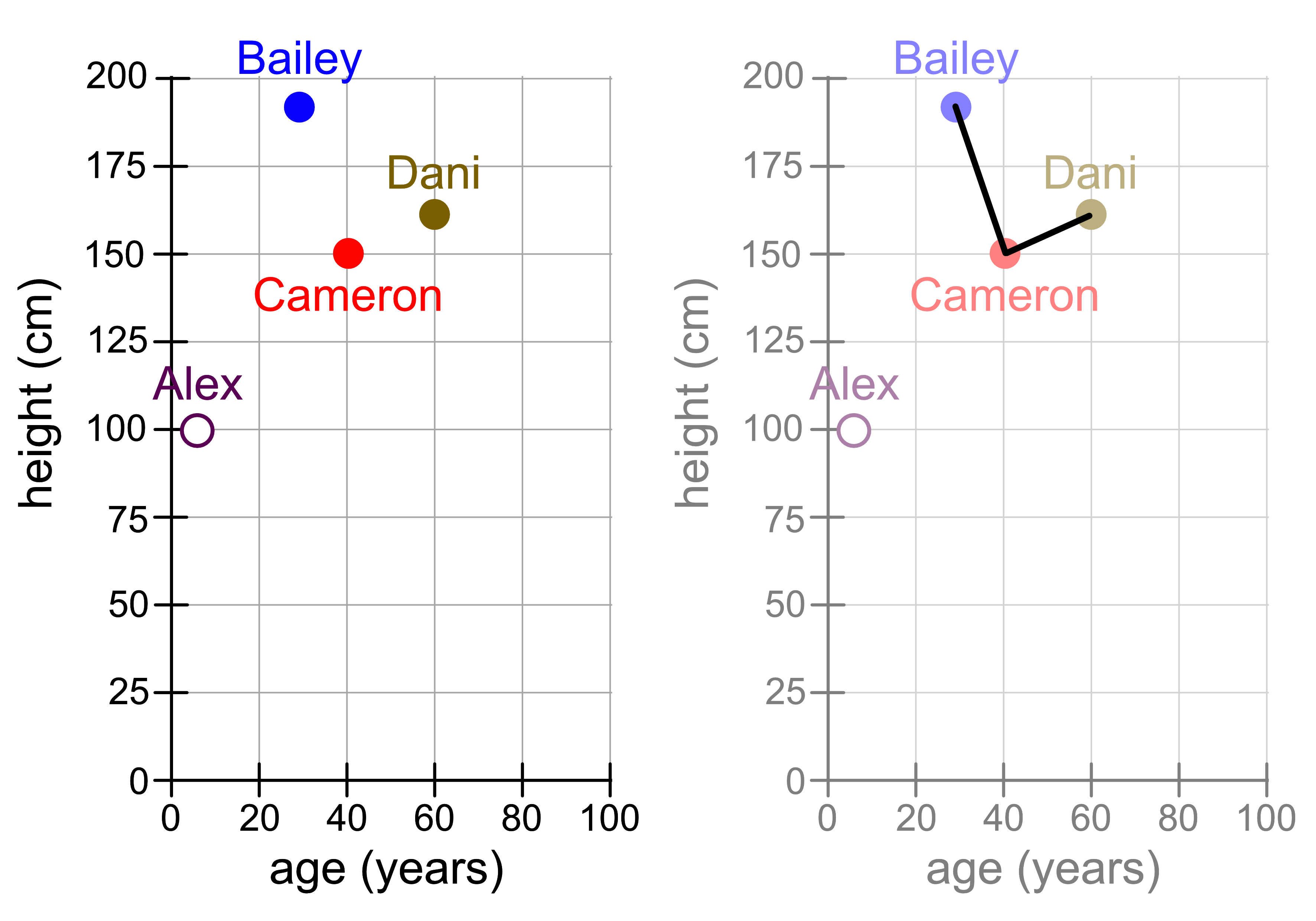 In the example we just saw, there is a problem with using pure distance to measure similarity. Age and years are quite similar in scale, in that age typically ranges from 0 - 100 years and height typically ranges from 0 - 200 cm. Other variables might be on a completely different scale. For example, age (0 - 100 years) and weekly salary ($0 - $1000). You will notice that each grid square represents 50 x 50 (years x $). Because the range of weekly salary values is so much larger than the scale of years, you’ll notice that the distance is dominated by the weekly salary variable and people tend to be close together if they have similar salaries, regardless of their age.