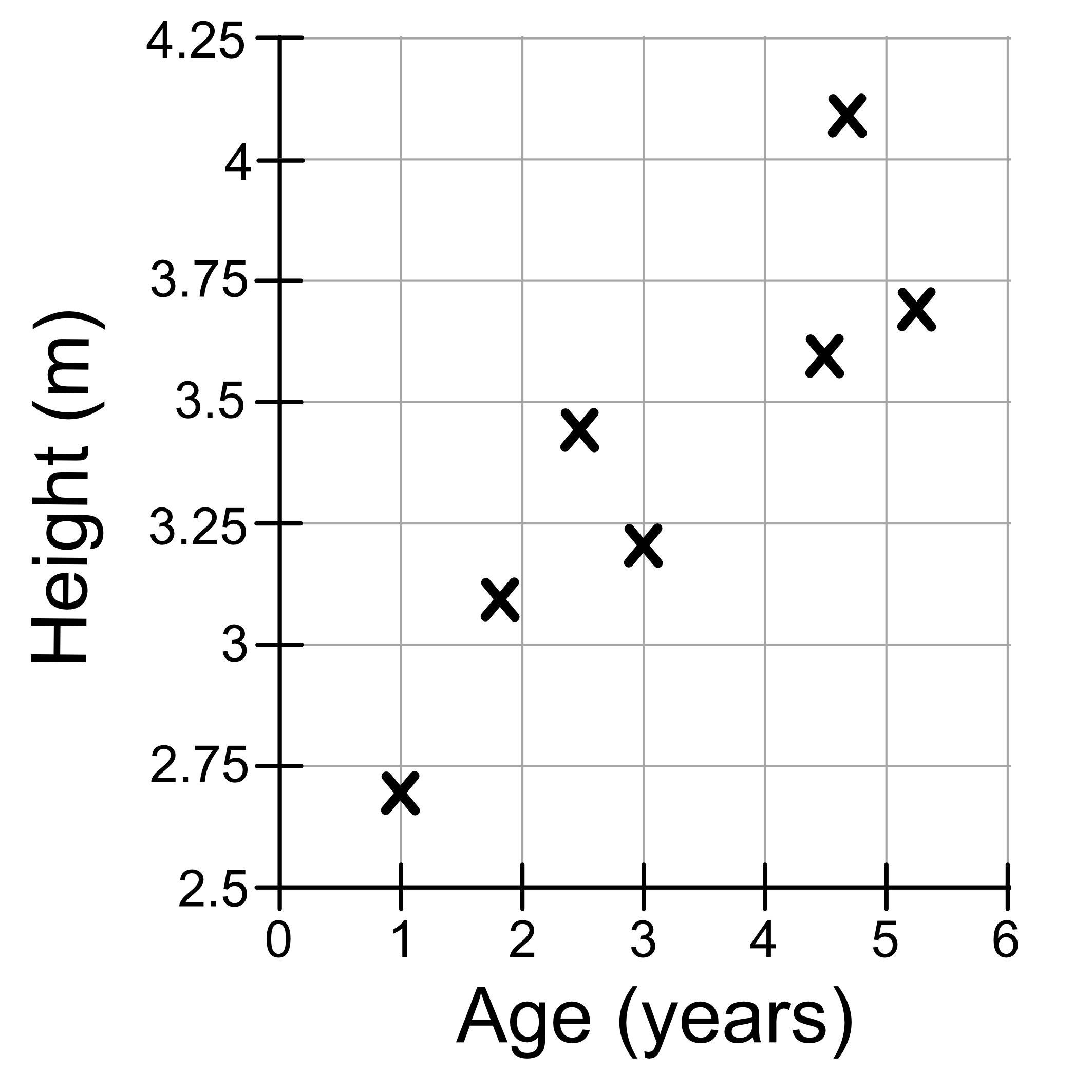 The two giraffes that are most similar in age are 2.4 and 3.0 years old. They have heights 3.2 and 3.4. The average of these values is 3.3, so we predict our giraffe is 3.3m tall.