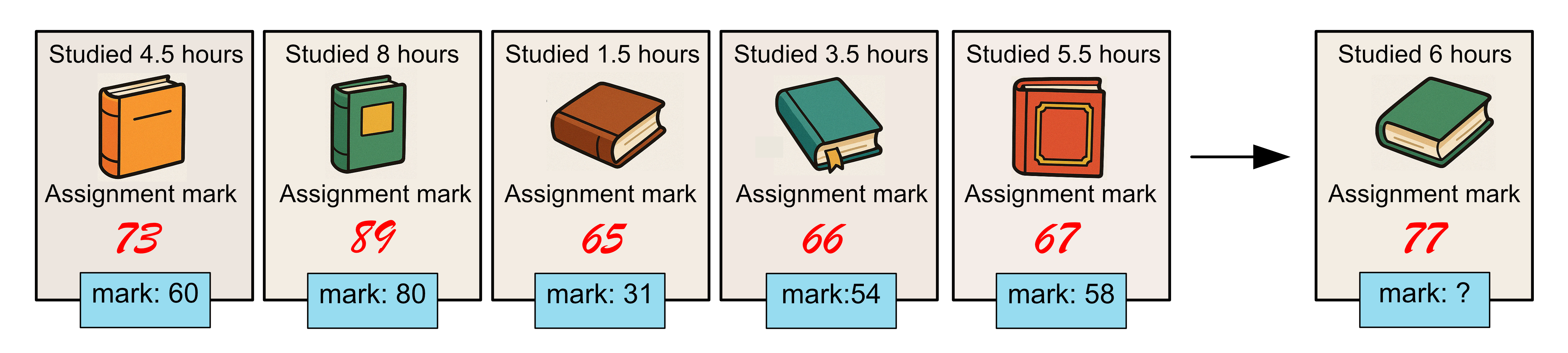 Below is a complete example, including a prediction for a test student who studied 6 hours and has an assignment mark of 77.
