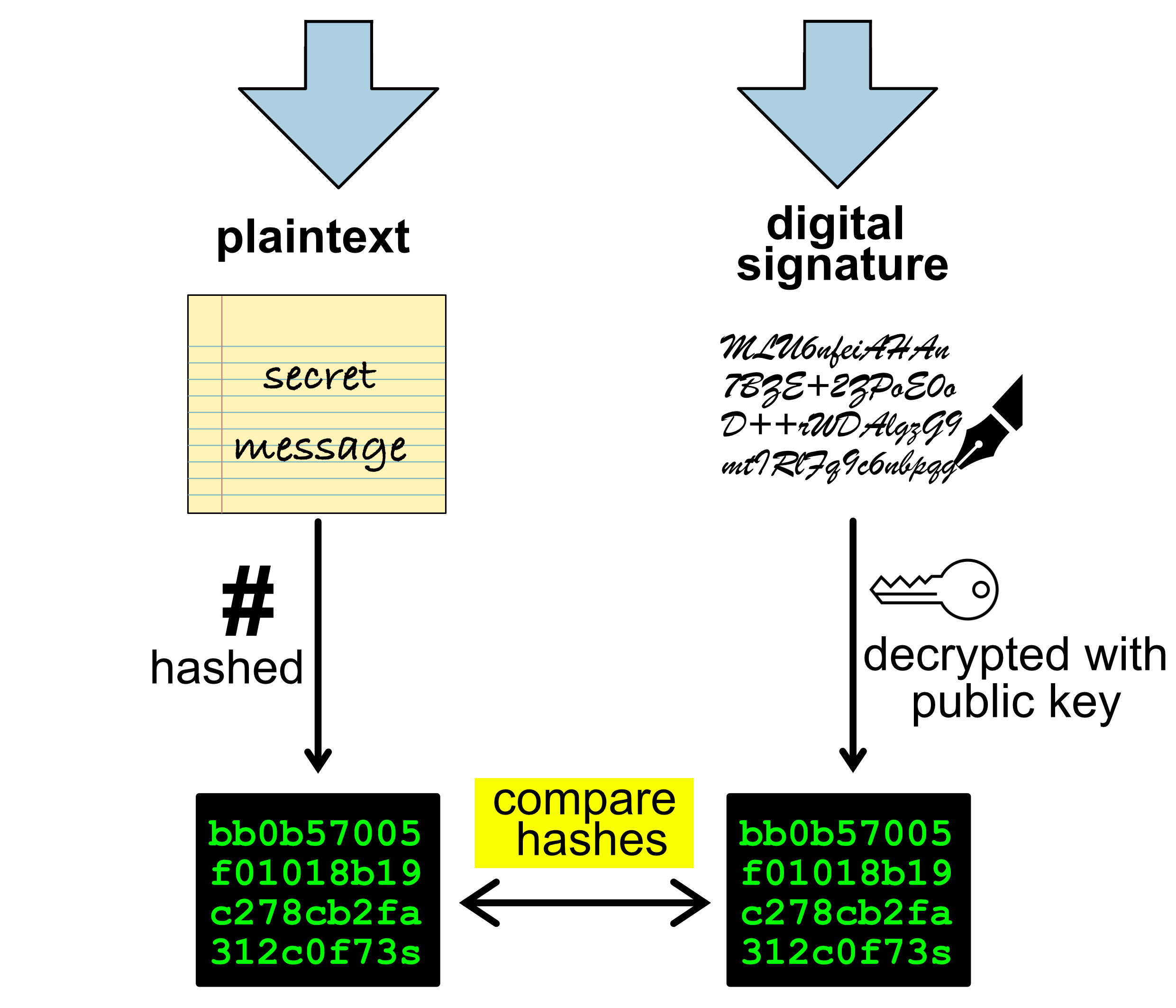 If the two hashes match then the signature is valid and it is confirmed that the sender was the creator of the message.